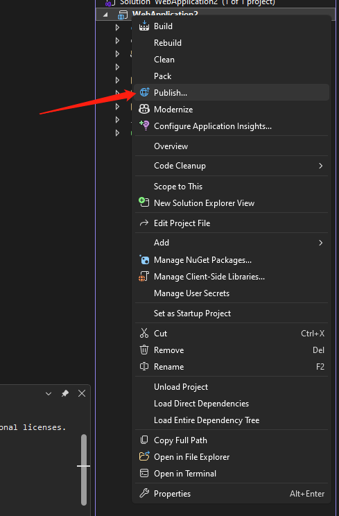 6) Open the 'Publish' settings in your project by right clicking on it in the Solution Explorer window and then selecting it.